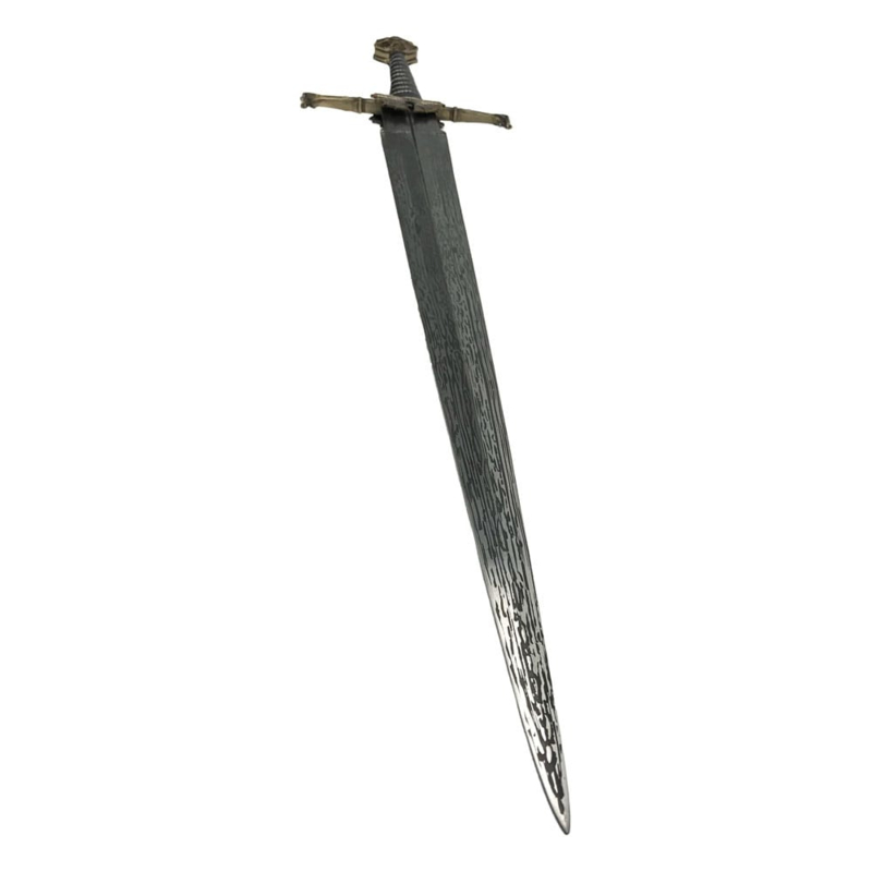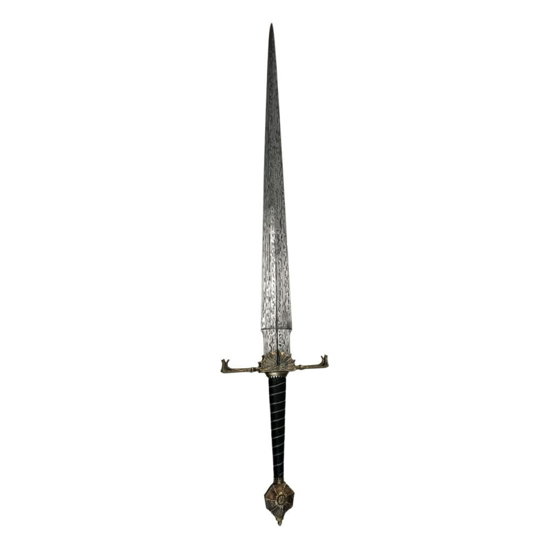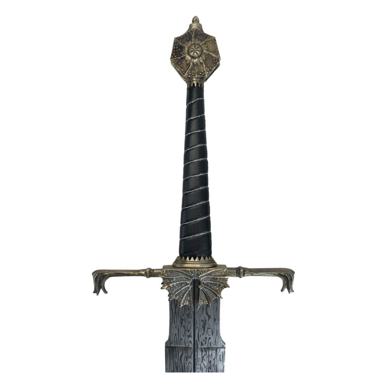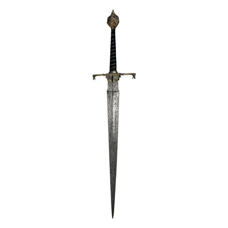 "A Targaryen must be seated on The Iron Throne." Viserys IBlackfyre is one of the ancestral Valyrian blades of House Targaryen. Passed down through the hands of many prominent members of the Targaryen line, it originally belonged to Aegon The Conqueror, founder of the Targaryen dynasty.Wielded as a symbol of power by King Viserys I, Blackfyre is a bastard sword, so nick-named because of its hand-&-a-half proportions. Its wide blade is a 'chopper' designed for both offence and defense.Tim Lewis, Master Armorer for House of the Dragon, contracted world-renowned swordsmith Peter Johnsson to make the original Blackfyre hero prop. A true master of his craft, Peter is also a historian with unparalleled knowledge of the ancient art of sword making. His expertise imbued Blackfyre with an authentic sense of character and heritage.The Factory Entertainment Blackfyre prop replica was created after careful study of the hero prop. Our team interviewed both Peter Johnsson and Tim Lewis, who each provided a wealth of previously unseen behind the scenes information including details and photographs of the construction of the original prop. We are very grateful for their assistance and input.Each replica has been created using similar traditional techniques to the original hero prop, including lost-wax casting. Similar materials have also been chosen including wood, leather and metal. To replicate the appearance of the Damascus steel blade used on the hero prop, the Factory Entertainment team elected to use high quality En42 spring steel with a pattern that has been chemically etched into the blade.Each replica includes a sequentially numbered wall hanging plaque and is presented in a full color box with a certificate of authenticity.Edition Size: 500 pieces.