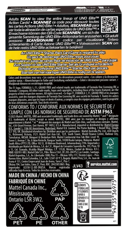 Adding the cards from the UNO Elite Formula 1 2025 Core Edition Expansion Set to a UNO Elite Formula 1 card game will speed up the race. Each set contains 3 expansion sets, each with 10 Elite special cards, for a total of 30 cards. Which card will be dealt? Each Elite special card has its own special power that comes into play when a player plays a card with an Elite symbol on it. And of course, players mustn't forget to shout "UNO!" when they have only one card left in their hand! This racing-themed game is a great gift for all Formula 1 and card game fans aged 7 and up. Colours and designs may vary.