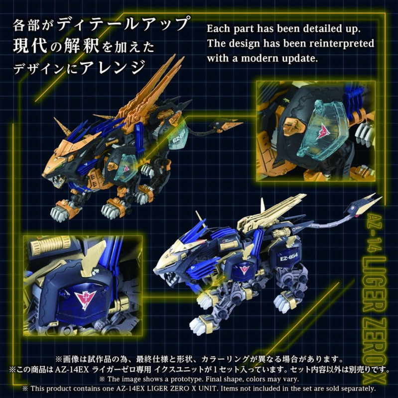 "?ADVANCED Zi?ZOIDS Moving Kit SeriesADVANCED - This series represents a step toward further evolution, the development of common sense. Based on themes set for each ZOIDS, this pinnacle brand embodies the ultimate form of the Moving Kit, incorporating "reconstruction," "refinement," and "honing."This product is a 1/72 scale assembly kit. This product contains only the unit (parts) required to recreate Liger Zero X when combined with an AZ series Liger Zero (base unit), such as the AZ-02EX2 Liger Zero Imperial Specification (sold separately) or the AZ-02 Liger Zero (sold separately). When equipped, various parts such as the shoulder covers, fins, drum capacitors, earth unit, and the back-mounted electro-driver are manually poseable. Includes a 1/72 scale unpainted pilot figure of a standard soldier, compatible with the cockpit of the Liger Zero (sold separately)."